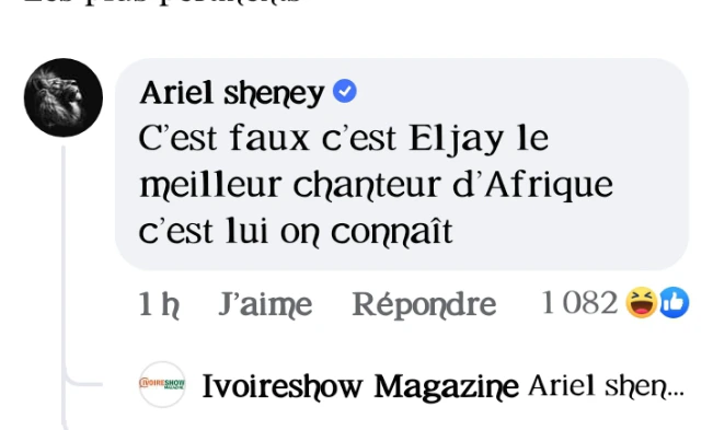 Ariel Sheney sous le post d’Ivoireshow Magazine : « C’est faux, c’est El Jay le meilleur chanteur d’Afrique, c’est lui, on connaît», a-t-il déclaré avec insistance.