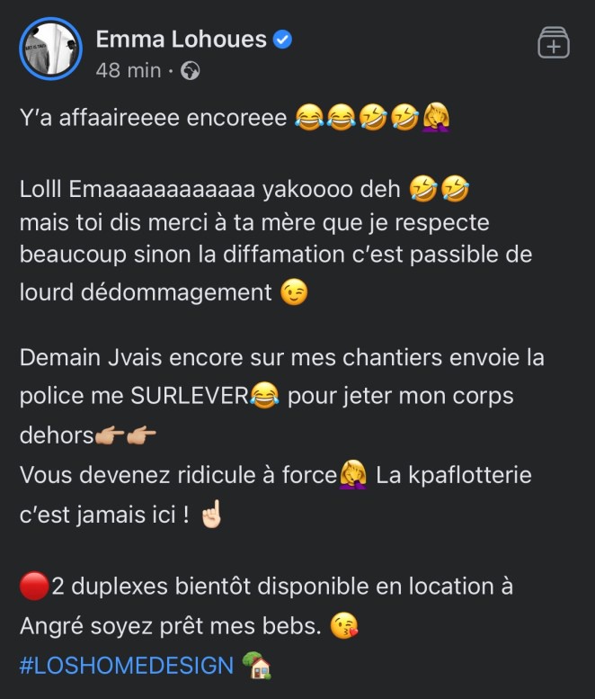 Et pour cause, un profil Twitter accuse Emma Lohoues de mentir à ses followers car elle n’aurait pas acheté une seule de ces bâtisses.
