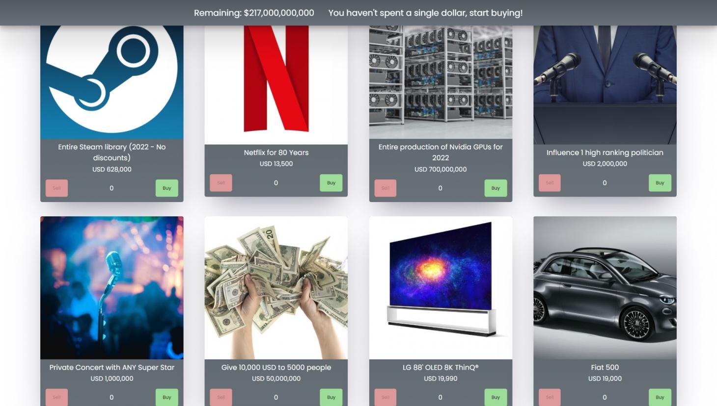 Dépenser la fortune de l’homme d’affaires, c’est désormais possible avec le site Spend Elon Musk’s Fortune. Si ce dernier possède 239 milliards de dollars (estimation), les concepteurs partent sur la base de 217 milliards de dollars.