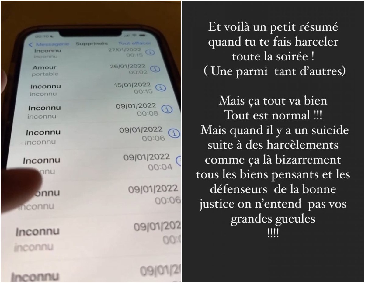 « Et voilà un petit résumé quand tu te fais harceler toute la soirée ! (Une parmi tant d’autres). Mais ça tout va bien. Tout est normal. Mais quand il y a un suicide suite à des harcèlements comme ça, bizarrement, tous les biens pensants et les défenseurs de la bonne justice, on n’entend pas vos grandes gueules ».