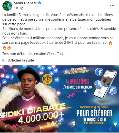 En effet, l’artiste malien de 29 ans, vient de passer la barre des 4 millions d’abonnés sur sa page Facebook.