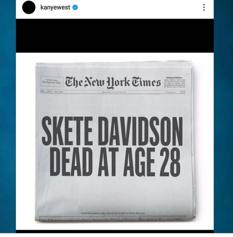 Hier, Kanye West a publié une image trafiquée d’une nécrologie en première page du New York Times qui disait : « Skete Davidson est mort à 28 ans », suite à l’annonce de Pete Davidson et Kim Kardashian l’appelant à arrêter.