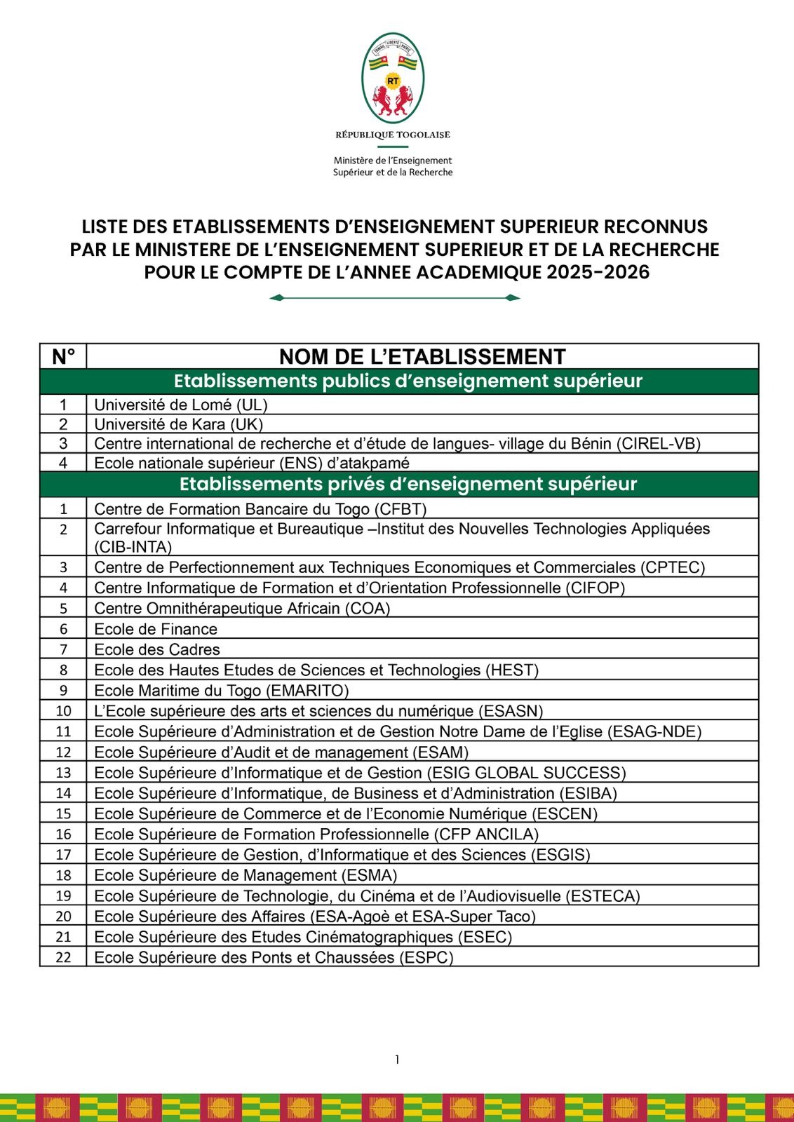 À quelques semaines de la rentrée universitaire pour l’année académique 2025-2026, le gouvernement togolais a publié la liste des établissements reconnus.