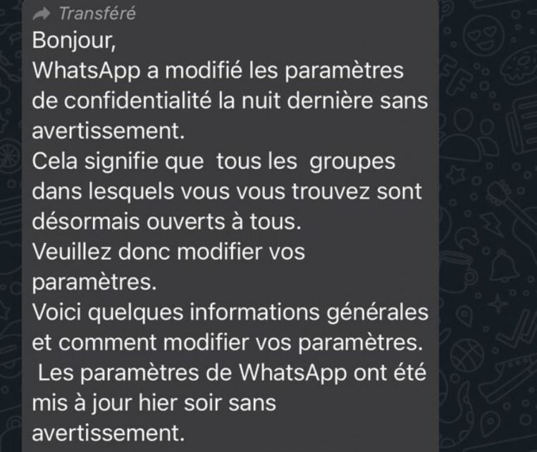 « WhatsApp a modifié les paramètres de confidentialité la nuit dernière sans avertissement. Cela signifie que tous les groupes dans lesquels vous vous trouvez sont désormais ouverts à tous » , signale le message viral signé parfois par un certain « Marco Sentein » . Si ce n’est pas celui que vous avez vu dernièrement, c’est peut-être celui-ci : « Pour info. Vérifiez vos comptes. Les nôtres étaient effectivement modifiés ! » .